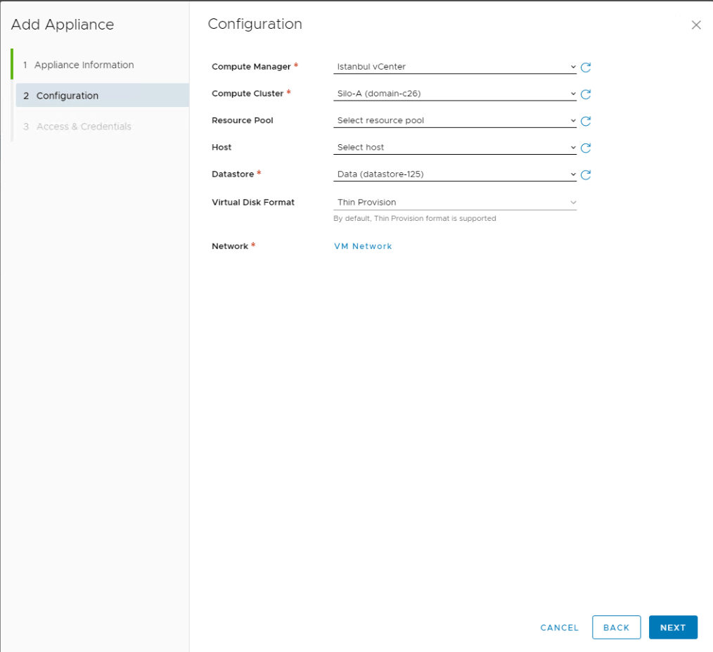 Configuration adımında bizlere hangi vCenter’a deploy edileceği, datastore , network yerleşimleri soruluyor. İlgili ayarları seçerek devam ediyorum.