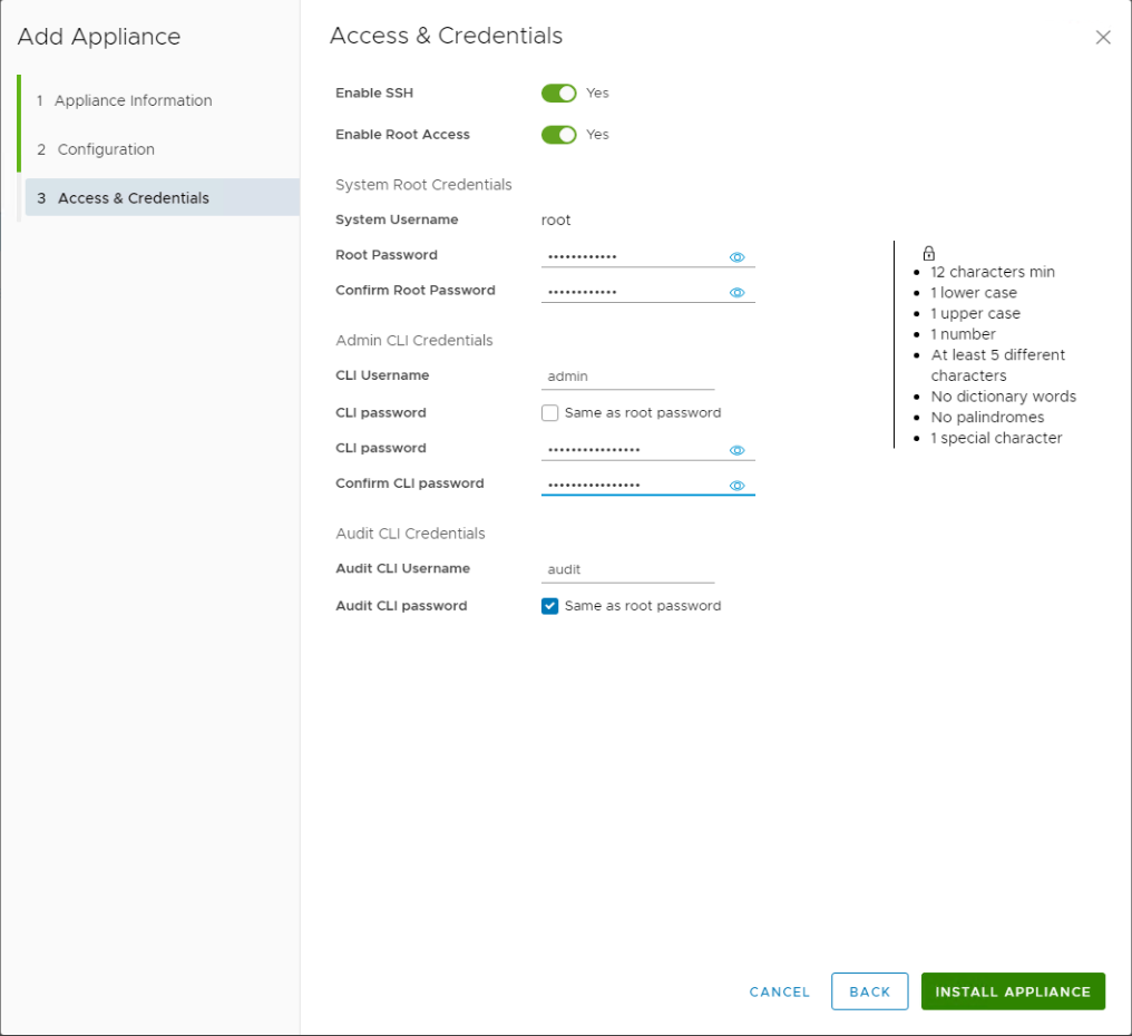 Üçüncü adımda Enable SSH ve Enable Root Access seçeneklerini işaretleyerek root admin ve audit userlarına şifre tanımlaması yapıyorum.