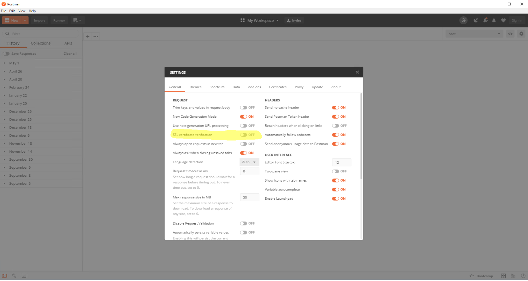API ile çalışmaya başlamadan önce Postman clientda SSL verification’ı kapatmanız gerekiyor. Bunun için File > Settings > General altında sarı ile işaretlediğim bölümü off yapmanız yeterli.